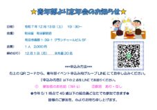 青年部では、2025年12月13日(土) 《町田屋》(町田市森野1-39-1 グランドゥールビル5階) において、忘年会を開催します。交流を深め、皆さんと共に来年への活力を高めていきたい思います。 多くの方のご参加をお待…続きを読む