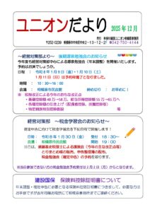 2026年1月16日(金) 午後2時から 会場 相模原事務所 ユニオンの顧問税理士、須藤基史先生がご相談をお受けします。 予約制です。前々日までに申し込んでください。 申込先は、所属されている…続きを読む
