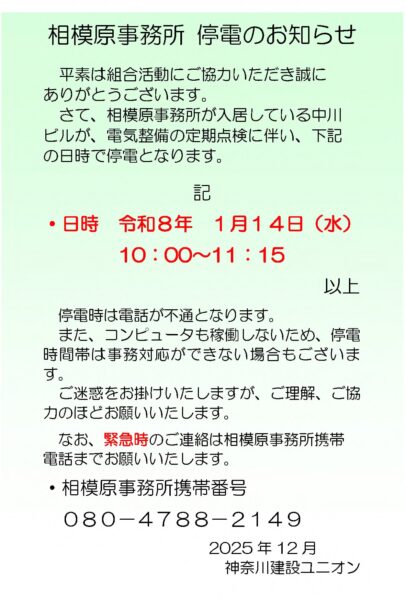 2026年1月14日(水) 午前10時00分~午前11時15分 の間、相模原事務所が入居している中川ビルの電気設備の定期点検のため停電となります。