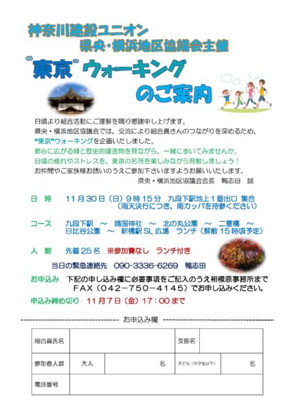県央・横浜地区協議会では、交流により組合員さんのつながりを深めるため、”東京”ウォーキングを企画いたしました。お仲間やご家族さまお誘いのうえご参加くださいますようお願いいたします。